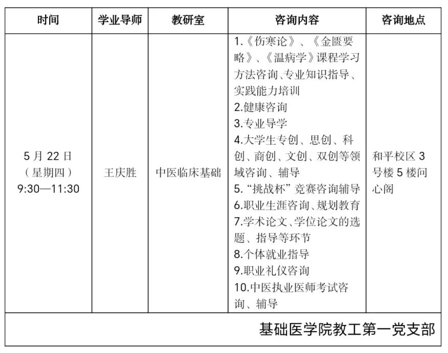 为切实增强全体党员的群众观念和服务意识,争做四有好老师,甘肃中医药大学基础医学院党委开设“学业诊室”,为学生做实事,帮助学生解决学业和生活中遇到的困难及问题。特聘请以下党员教师为学生“学业导师”,个性指导学生,提高学业水平。